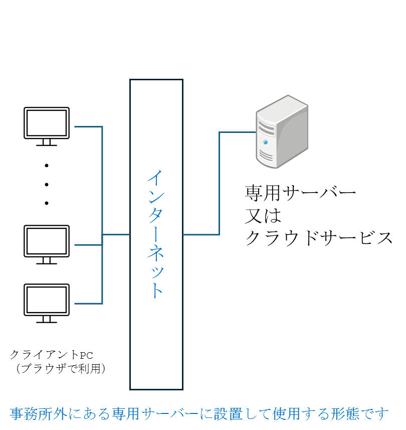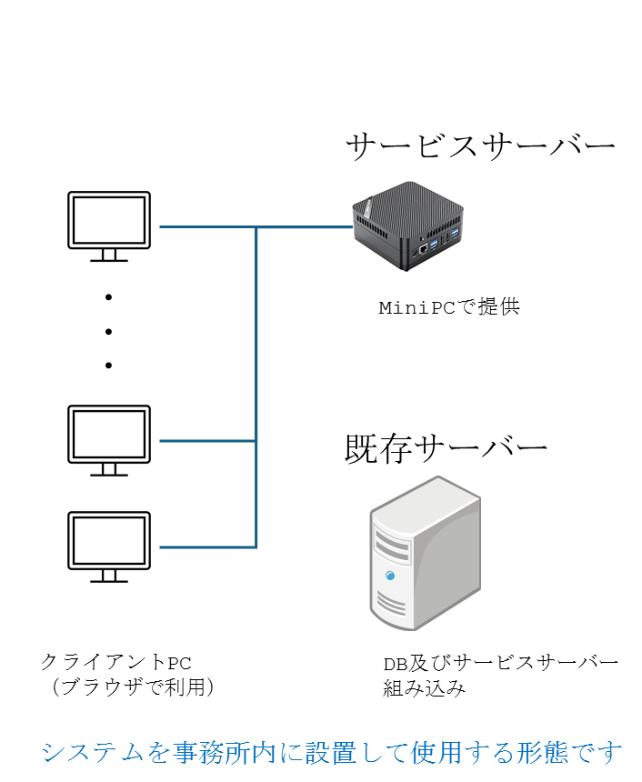 本システムをお客様社内で運用する形態です。契約後、本システムを組み込み済みの専用パソコン(DBサーバー機能実装)(※1)をお届けします。お客様のネットワーク内に設置してください。